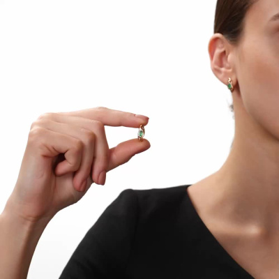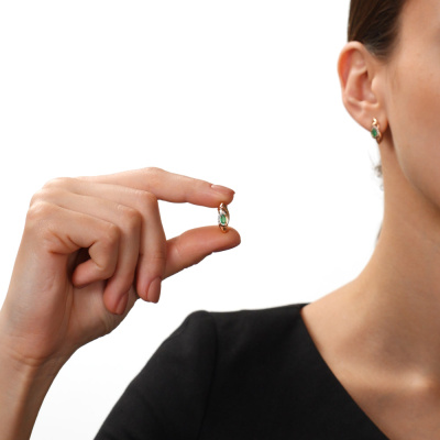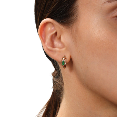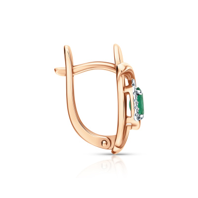 Серьги с 14 бриллиантами природными, 0.03 карат, огранка круг 17 граней, цвет 2, чистота 2, тип огранки А; 2 изумрудами природными, 0.4 карат, цвет 3, чистота 3, тип огранки Б; Розовое золото 585 пробы.