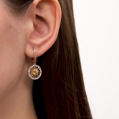 Серьги с 64 бриллиантами природными, 0.18 карат, огранка круг 17 граней, цвет 2, чистота 2, тип огранки А; 2 сапфирами желтыми природными, 0.96 карат, тип огранки В; Розовое золото 585 пробы.