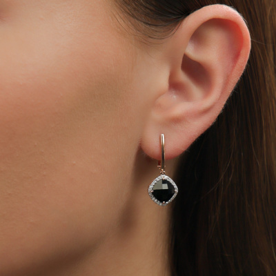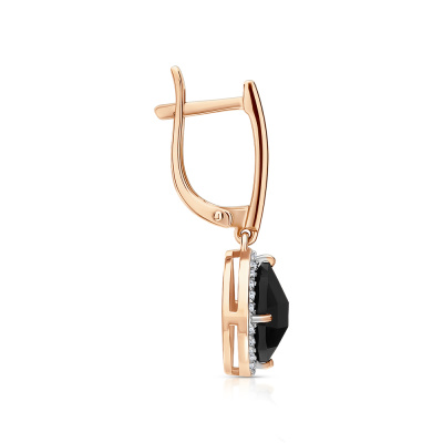 Серьги с 48 бриллиантами природными, 0.23 карат, огранка круг 17 граней, цвет 2, чистота 2, тип огранки А; 2 агатами черными природными, 3.39 карат; Розовое золото 585 пробы.