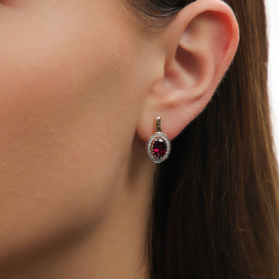 Золотые серьги с бриллиантами природными и родолитами природными