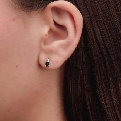 Серьги с 6 бриллиантами природными, 0.03 карат, огранка круг 17 граней, цвет 2, чистота 2, тип огранки А; 2 сапфирами природными, 0.6 карат, цвет 2, чистота 2, тип огранки Б; Белое золото 585 пробы.