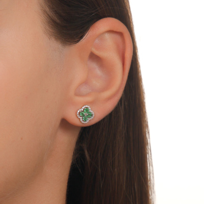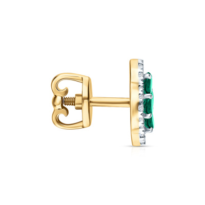 Серьги с 48 бриллиантами природными, 0.13 карат, огранка круг 17 граней, цвет 2, чистота 2, тип огранки А; 8 изумрудами природными, 0.62 карат, цвет 3, чистота 3, тип огранки В; Желтое золото 585 пробы.