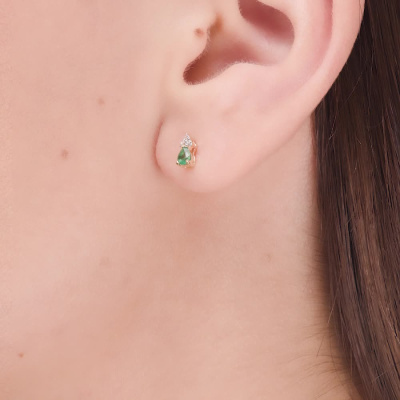 Серьги с 6 бриллиантами природными, 0.04 карат, огранка круг 17 граней, цвет 2, чистота 2, тип огранки А; 2 изумрудами природными, 0.25 карат, цвет 3, чистота 3, тип огранки Б; Желтое золото 585 пробы.