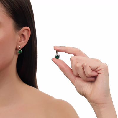 Серьги с 56 бриллиантами природными, 0.17 карат, огранка круг 17 граней, цвет 2, чистота 2, тип огранки Б; 2 гидротермальными изумрудами, 3.53 карат; Розовое золото 585 пробы.