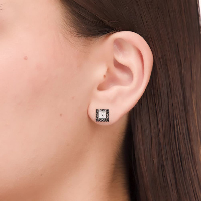 Серьги с 16 бриллиантами природными, 0.07 карат, огранка круг 17 граней, цвет 2, чистота 2, тип огранки А; 32 бриллиантами черными природными облагороженными, 0.3 карат, огранка круг 57 граней, цвет 7, чистота 6, тип огранки А; Белое золото 585 пробы.