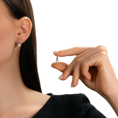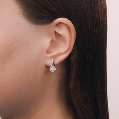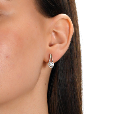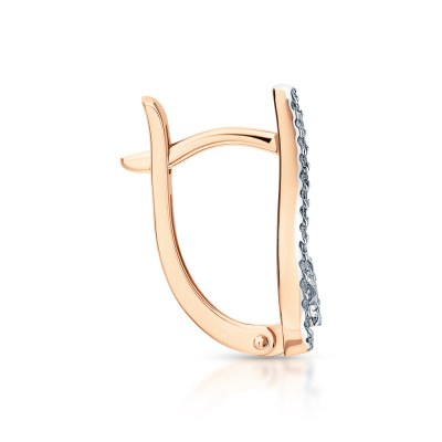 Серьги с 2 бриллиантами природными, 0.03 карат, огранка круг 57 граней, цвет 3, чистота 6, тип огранки А; 12 бриллиантами природными, 0.08 карат, огранка круг 57 граней, цвет 3, чистота 6, тип огранки А; 50 бриллиантами природными, 0.12 карат, огранка круг 17 граней, цвет 2, чистота 2, тип огранки А; Розовое и белое золото 585 пробы.