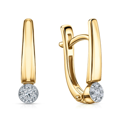 Серьги с 2 бриллиантами природными, 0.03 карат, огранка круг 57 граней, цвет 3, чистота 6, тип огранки А; 12 бриллиантами природными, 0.05 карат, огранка круг 17 граней, цвет 2, чистота 2, тип огранки А; Желтое золото 585 пробы.