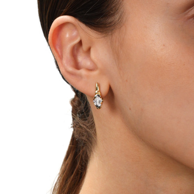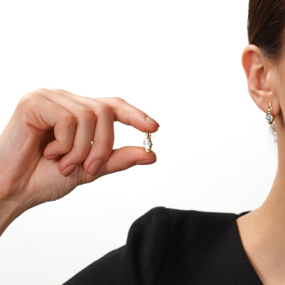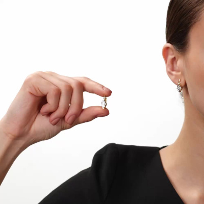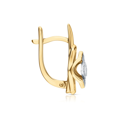 Серьги с 2 бриллиантами природными, 0.03 карат, огранка круг 57 граней, цвет 3, чистота 6, тип огранки А; 32 бриллиантами природными, 0.05 карат, огранка круг 17 граней, цвет 2, чистота 2, тип огранки А; Желтое и белое золото 585 пробы.