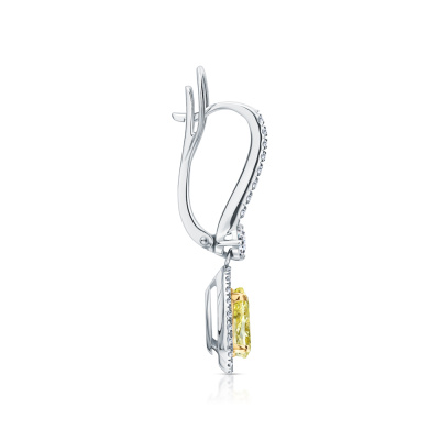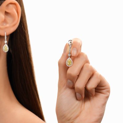 Серьги с 2 бриллиантами выращенными, 2.05 карат, огранка груша 56 граней, цвет Желтый, чистота 5, тип огранки А; 2 бриллиантами выращенными, 0.32 карат, огранка круг 57 граней, цвет 3, чистота 5, тип огранки А; 8 бриллиантами выращенными, 0.1 карат, огранка круг 57 граней, цвет 3, чистота 5, тип огранки А; 48 бриллиантами выращенными, 0.36 карат, огранка круг 57 граней, цвет 3, чистота 5, тип огранки А; Желтое и белое золото 585 пробы.
