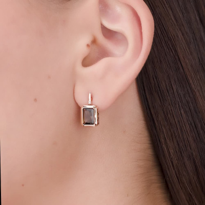 Серьги с 2 бриллиантами природными, 0.008 карат, огранка круг 17 граней, цвет 2, чистота 2, тип огранки А; 2 кварцами дымчатыми природными, 2.82 карат; Розовое золото 585 пробы.