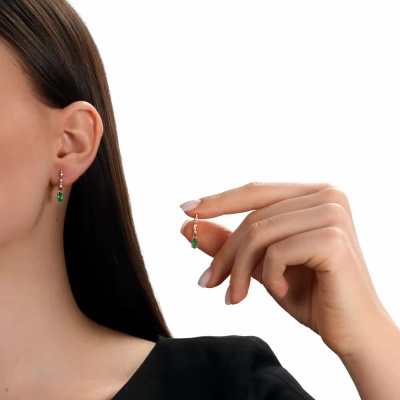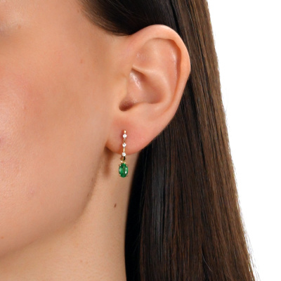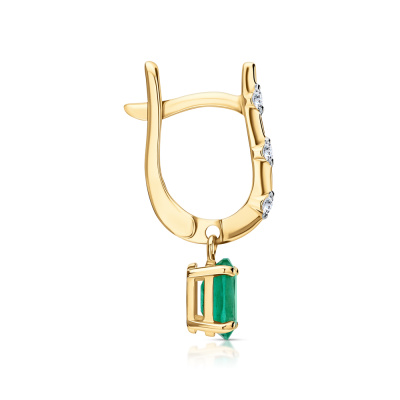 Серьги с 6 бриллиантами природными, 0.08 карат, огранка круг 57 граней, цвет 3, чистота 6, тип огранки А; 2 изумрудами природными, 0.81 карат, цвет 4, чистота 3, тип огранки Б; Желтое золото 585 пробы.