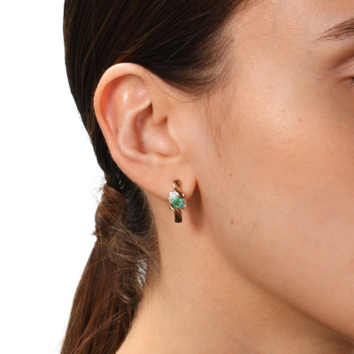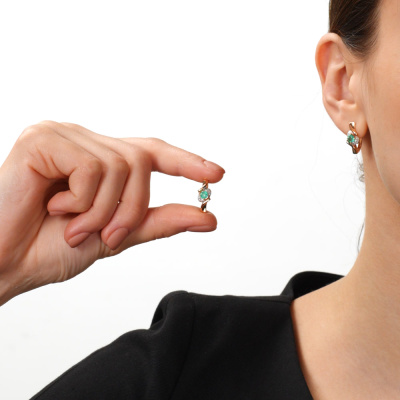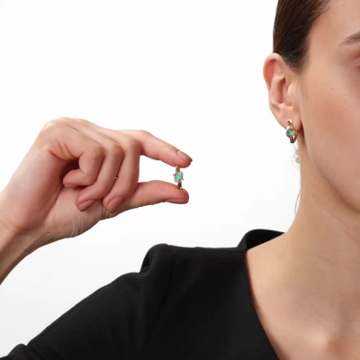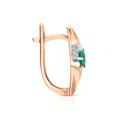Серьги с 28 бриллиантами природными, 0.12 карат, огранка круг 17 граней, цвет 2, чистота 2, тип огранки А; 2 изумрудами природными, 0.51 карат, цвет 3, чистота 3, тип огранки В; Розовое золото 585 пробы.