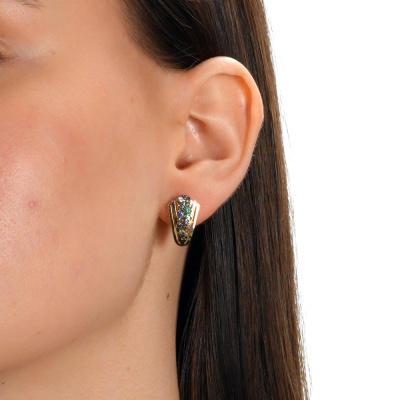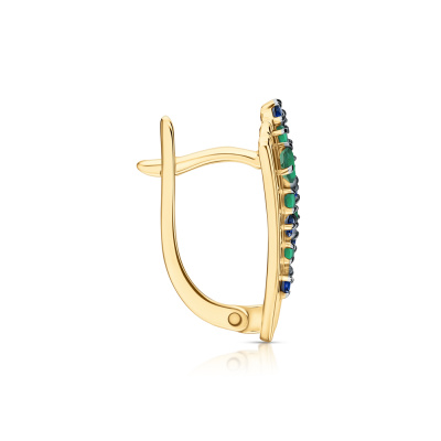 Серьги с 2 изумрудами природными, 0.11 карат, цвет 3, чистота 3, тип огранки В; 2 сапфирами природными, 0.07 карат, цвет 2, чистота 2, тип огранки В; 4 сапфирами природными, 0.07 карат, цвет 2, чистота 2, тип огранки В; 6 изумрудами природными, 0.07 карат, цвет 3, чистота 3, тип огранки В; 8 сапфирами природными, 0.09 карат, цвет 2, чистота 2, тип огранки В; 8 изумрудами природными, 0.06 карат, цвет 3, чистота 3, тип огранки В; Желтое золото 585 пробы.