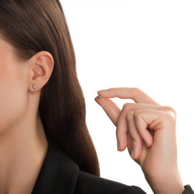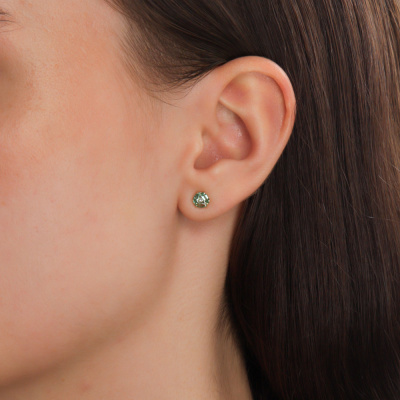Серьги с 2 бриллиантами природными, 0.01 карат, огранка круг 17 граней, цвет 2, чистота 2, тип огранки А; 6 изумрудами природными, 0.39 карат, цвет 3, чистота 3, тип огранки Б; Желтое золото 585 пробы.