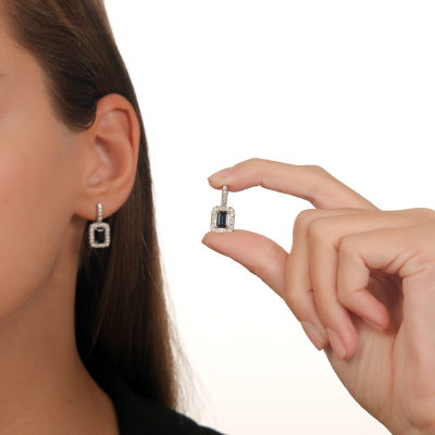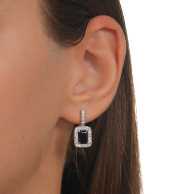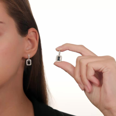 Серьги с 46 бриллиантами природными, 0.63 карат, огранка круг 57 граней, цвет 3, чистота 6, тип огранки А; 2 сапфирами природными, 2.13 карат, цвет 2, чистота 2, тип огранки Б; Белое золото 585 пробы.