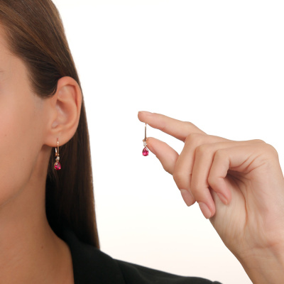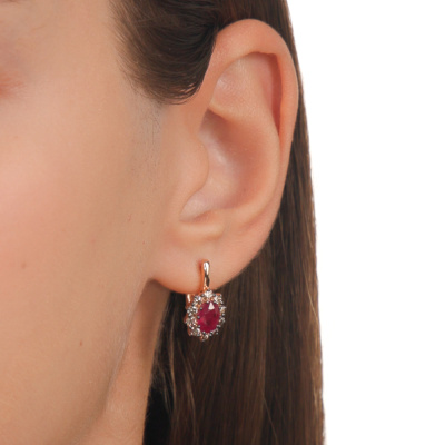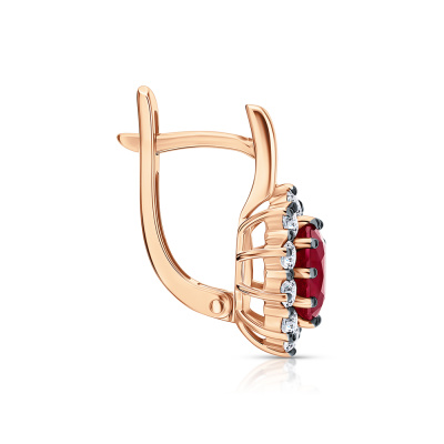 Серьги с 2 рубинами природными, 2.1 карат, цвет 2, чистота 2, тип огранки Б; 20 бриллиантами коньячными природными, 0.77 карат, огранка круг 57 граней, цвет 7, чистота 6, тип огранки А; Розовое золото 585 пробы.