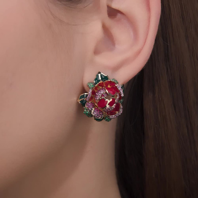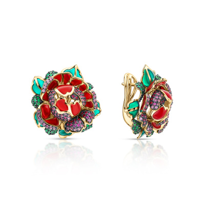 Серьги с 77 сапфирами розовыми природными, 0.49 карат, цвет 2, чистота 2, тип огранки А; 3 сапфирами розовыми природными, 0.01 карат, цвет 2, чистота 2, тип огранки А; 54 сапфирами розовыми природными, 0.31 карат, цвет 3, чистота 3, тип огранки А; 50 рубинами природными, 0.27 карат, цвет 2, чистота 2, тип огранки А; 122 изумрудами природными, 0.42 карат, цвет 3, чистота 3, тип огранки А; 1 эмаль витражная, тип огранки А; Желтое золото 585 пробы.