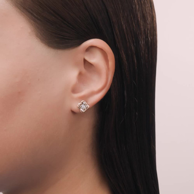 Серьги с 2 бриллиантами природными, 0.04 карат, огранка круг 57 граней, цвет 3, чистота 6, тип огранки А; Розовое и белое золото 585 пробы.