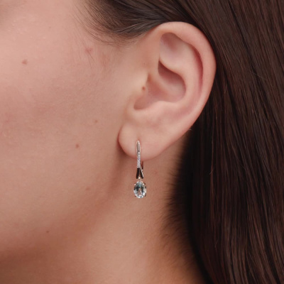 Серьги с 10 бриллиантами природными, 0.05 карат, огранка круг 17 граней, цвет 2, чистота 2, тип огранки А; 2 топазами скай природными, 1.89 карат; Розовое золото 585 пробы.