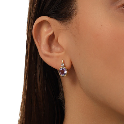 Серьги с 2 бриллиантами природными, 0.01 карат, огранка круг 17 граней, цвет 2, чистота 2, тип огранки А; 2 аметистами природными, 3.58 карат; Желтое и белое золото 585 пробы.