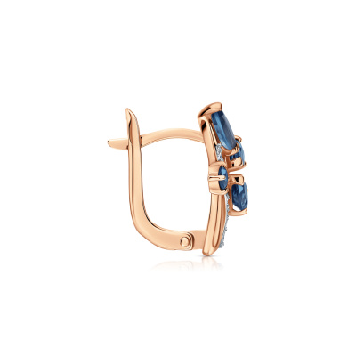 Серьги с 18 бриллиантами природными, 0.06 карат, огранка круг 17 граней, цвет 2, чистота 2, тип огранки А; 4 топазами лондон природными, 0.67 карат; 2 топазами лондон природными, 0.32 карат; 4 топазами лондон природными, 0.22 карат; Розовое золото 585 пробы.