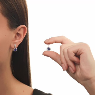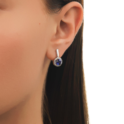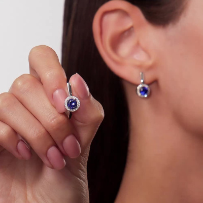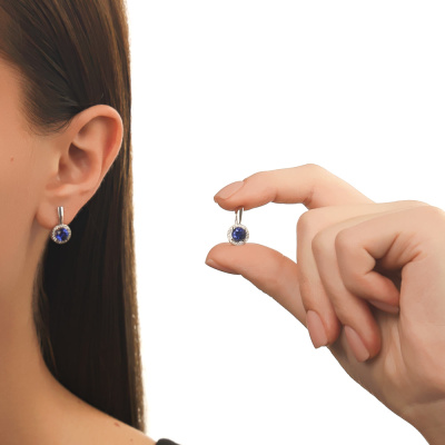 Серьги с 2 сапфирами выращенными, 2.05 карат; 40 бриллиантами выращенными, 0.16 карат, огранка круг 57 граней, цвет 3, чистота 6, тип огранки А; Белое золото 585 пробы.