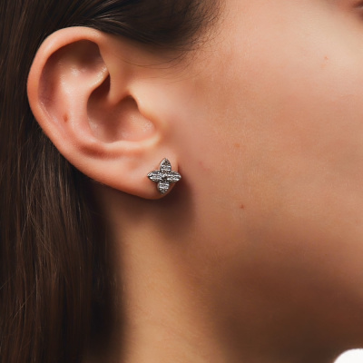 Серьги с 8 бриллиантами природными, 0.02 карат, огранка круг 17 граней, цвет 3, чистота 3, тип огранки Б; Серебро 925 пробы.