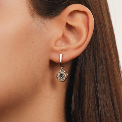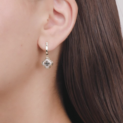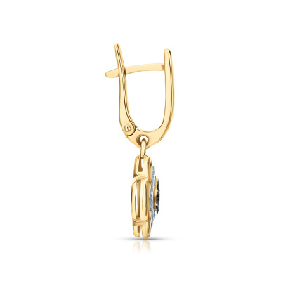 Серьги с 2 бриллиантами природными, 0.04 карат, огранка круг 57 граней, цвет 7, чистота 6, тип огранки А; 8 бриллиантами природными, 0.06 карат, огранка круг 57 граней, цвет 7, чистота 6, тип огранки А; 8 бриллиантами природными, 0.02 карат, огранка круг 17 граней, цвет 2, чистота 2, тип огранки А; Желтое золото 585 пробы.