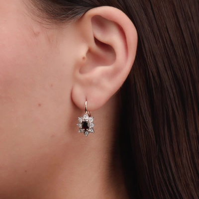 Серьги с 16 бриллиантами природными, 0.22 карат, огранка круг 57 граней, цвет 4, чистота 5, тип огранки А; 2 гранатами природными, 1.14 карат; Розовое и белое золото 585 пробы.