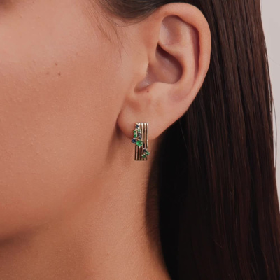 Серьги с 2 изумрудами природными, 0.09 карат, цвет 3, чистота 3, тип огранки В; 2 сапфирами природными, 0.07 карат, цвет 2, чистота 2, тип огранки В; 2 сапфирами природными, 0.04 карат, цвет 2, чистота 2, тип огранки В; 6 сапфирами природными, 0.07 карат, цвет 2, чистота 2, тип огранки В; 6 изумрудами природными, 0.06 карат, цвет 3, чистота 3, тип огранки В; 4 изумрудами природными, 0.02 карат, цвет 3, чистота 3, тип огранки В; Желтое золото 585 пробы.