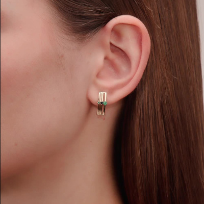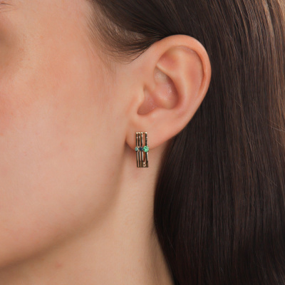 Серьги с 2 изумрудами природными, 0.11 карат, цвет 3, чистота 3, тип огранки В; 2 сапфирами природными, 0.06 карат, цвет 2, чистота 2, тип огранки В; 2 изумрудами природными, 0.02 карат, цвет 3, чистота 3, тип огранки В; Желтое золото 585 пробы.