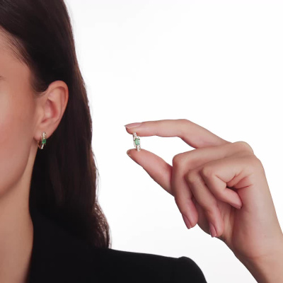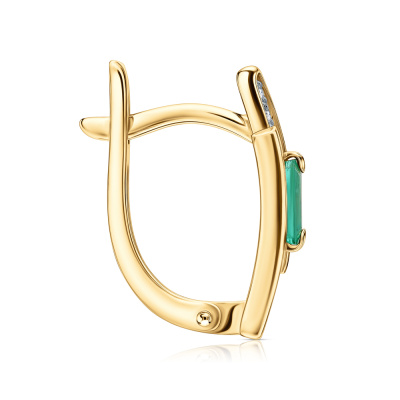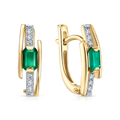Серьги с 12 бриллиантами природными, 0.09 карат, огранка круг 57 граней, цвет 3, чистота 6, тип огранки А; 2 изумрудами природными, 0.44 карат, цвет 4, чистота 3, тип огранки Б; Желтое золото 585 пробы.