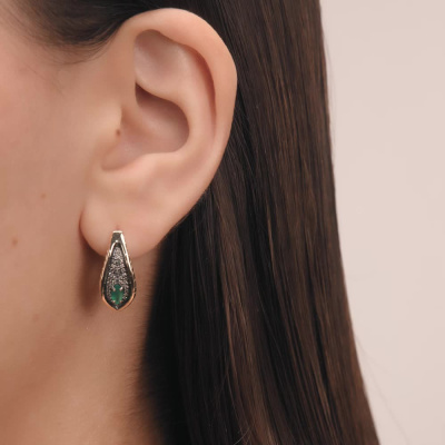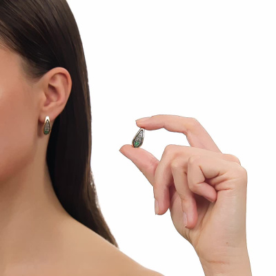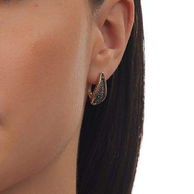 Серьги с 2 изумрудами природными, 0.4 карат, цвет 3, чистота 3, тип огранки Б; 4 бриллиантами черными природными облагороженными, 0.02 карат, огранка круг 57 граней, цвет 7, чистота 6, тип огранки А; 62 бриллиантами коньячными природными, 0.21 карат, огранка круг 57 граней, цвет 7, чистота 5, тип огранки А; Желтое золото 585 пробы.