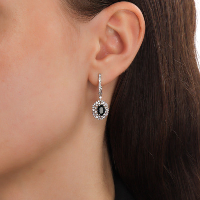 Серьги с 14 бриллиантами природными, 0.18 карат, огранка круг 57 граней, цвет 3, чистота 6, тип огранки А; 24 бриллиантами природными, 0.16 карат, огранка круг 57 граней, цвет 3, чистота 6, тип огранки А; 34 бриллиантами природными, 0.12 карат, огранка круг 17 граней, цвет 2, чистота 2, тип огранки Б; 26 бриллиантами природными, 0.07 карат, огранка круг 17 граней, цвет 2, чистота 2, тип огранки Б; 2 сапфирами природными, 1.83 карат, цвет 2, чистота 2, тип огранки Б; Белое золото 585 пробы.