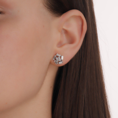 Серьги с 14 бриллиантами выращенными, 1.57 карат, огранка багет 33 грани, цвет 3, чистота 6, тип огранки А; Белое золото 585 пробы.