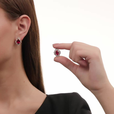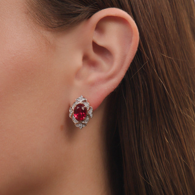 Серьги с 4 бриллиантами природными, 0.03 карат, огранка круг 17 граней, цвет 2, чистота 2, тип огранки А; 48 бриллиантами природными, 0.19 карат, огранка круг 17 граней, цвет 2, чистота 2, тип огранки А; 2 рубинами синтетическими, 4.3 карат; Розовое золото 585 пробы.