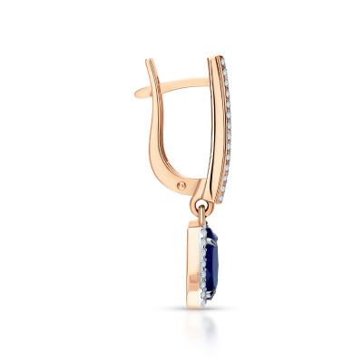 Серьги с 60 бриллиантами природными, 0.24 карат, огранка круг 17 граней, цвет 2, чистота 2, тип огранки А; 2 сапфирами природными, 3.2 карат, цвет 2, чистота 2, тип огранки Б; Розовое золото 585 пробы.