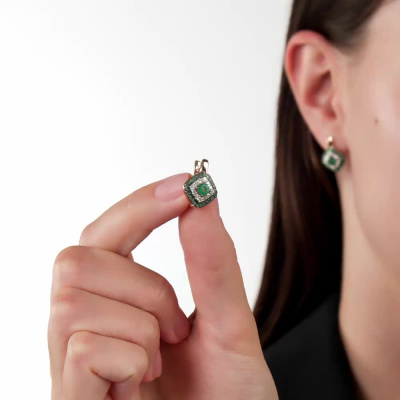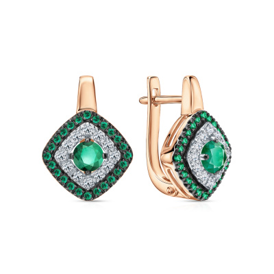 Серьги с 24 бриллиантами природными, 0.21 карат, огранка круг 17 граней, цвет 2, чистота 2, тип огранки А; 2 изумрудами природными, 0.5 карат, цвет 3, чистота 3, тип огранки В; 48 изумрудами природными, 0.17 карат, цвет 3, чистота 3, тип огранки В; Розовое золото 585 пробы.