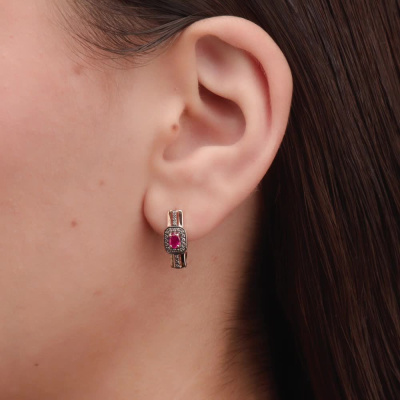Серьги с 2 рубинами природными, 0.38 карат, цвет 2, чистота 2, тип огранки Б; 44 бриллиантами коньячными природными, 0.11 карат, огранка круг 57 граней, цвет 7, чистота 5, тип огранки А; Розовое золото 585 пробы.