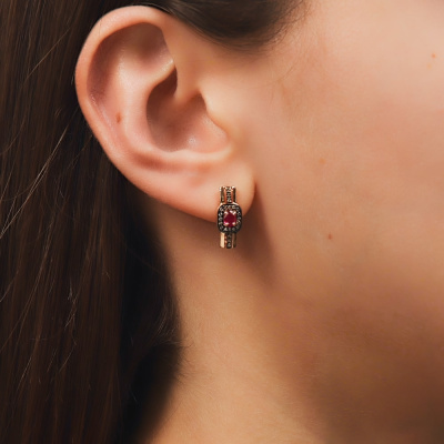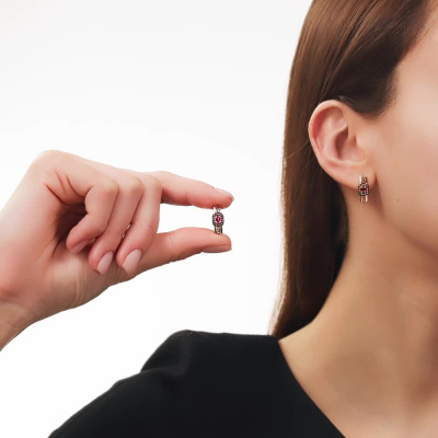 Серьги с 2 рубинами природными, 0.39 карат, цвет 2, чистота 2, тип огранки Б; 44 бриллиантами коньячными природными, 0.1 карат, огранка круг 57 граней, цвет 7, чистота 5, тип огранки А; Розовое золото 585 пробы.