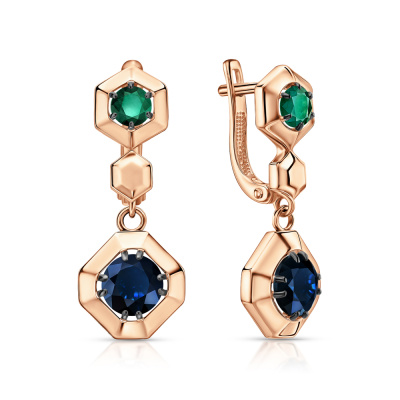 Серьги с 2 сапфирами синтетическими, 2.03 карат; 2 гидротермальными изумрудами, 0.44 карат; Розовое золото 585 пробы.