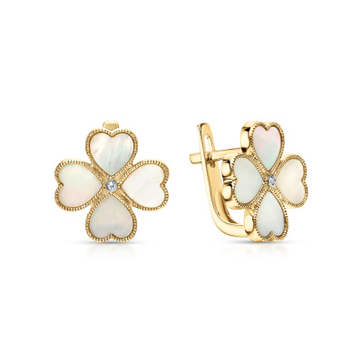 Серьги с 2 бриллиантами природными, 0.006 карат, огранка круг 17 граней, цвет 2, чистота 3; 8 перламутрами белыми природными; Желтое золото 585 пробы.