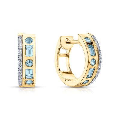 Серьги с 32 бриллиантами природными, 0.06 карат, огранка круг 17 граней, цвет 2, чистота 3; 10 топазами свисс природными, 0.61 карат; Желтое золото 585 пробы.