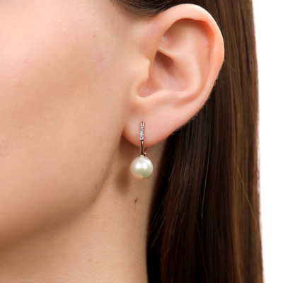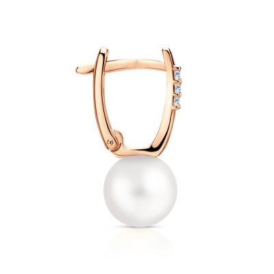 Серьги с 6 бриллиантами природными, 0.08 карат, огранка круг 17 граней, цвет 2, чистота 2, тип огранки А; 2 жемчугами пресноводными культ.белыми; Розовое золото 585 пробы.