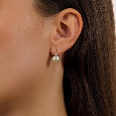 Серьги с 6 бриллиантами природными, 0.08 карат, огранка круг 17 граней, цвет 2, чистота 2, тип огранки А; 2 жемчугами пресноводными культ.белыми; Розовое золото 585 пробы.