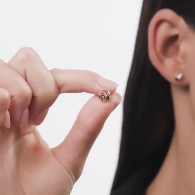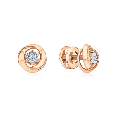 Серьги с 2 бриллиантами природными, 0.01 карат, огранка круг 57 граней, цвет 3, чистота 6, тип огранки А; Розовое и белое золото 585 пробы.