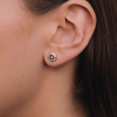 Серьги с 2 бриллиантами природными, 0.03 карат, огранка круг 57 граней, цвет 3, чистота 6, тип огранки А; 16 бриллиантами природными, 0.06 карат, огранка круг 17 граней, цвет 2, чистота 2, тип огранки А; Желтое и белое золото 585 пробы.