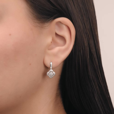 Серьги с 2 бриллиантами природными, 0.21 карат, огранка круг 57 граней, цвет 3, чистота 6, тип огранки А; 8 бриллиантами природными, 0.11 карат, огранка круг 57 граней, цвет 3, чистота 6, тип огранки А; 40 бриллиантами природными, 0.19 карат, огранка круг 17 граней, цвет 2, чистота 2, тип огранки А; Белое золото 585 пробы.