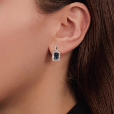 Серьги с 40 бриллиантами природными, 0.16 карат, огранка круг 17 граней, цвет 2, чистота 2, тип огранки А; 2 топазами лондон природными, 1.36 карат; Розовое золото 585 пробы.