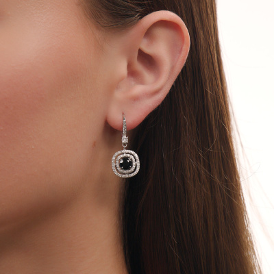 Серьги с 6 бриллиантами природными, 0.04 карат, огранка круг 57 граней, цвет 3, чистота 6, тип огранки А; 2 бриллиантами природными, 0.01 карат, огранка круг 17 граней, цвет 2, чистота 2, тип огранки Б; 48 бриллиантами природными, 0.19 карат, огранка круг 17 граней, цвет 2, чистота 2, тип огранки Б; 38 бриллиантами природными, 0.08 карат, огранка круг 17 граней, цвет 2, чистота 2, тип огранки Б; 12 бриллиантами природными, 0.02 карат, огранка круг 17 граней, цвет 2, чистота 2, тип огранки Б; 2 сапфирами природными, 1.77 карат, цвет 2, чистота 2, тип огранки В; Белое золото 585 пробы.
